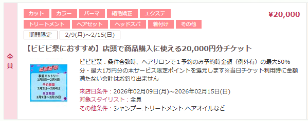 ホットペッパー主催の過去最大級キャンペーン「ビビビ祭」開催。対象金額の最大50%、最大10,000ポイント還元が受けられるお得なチャンスです。当店では予約期間中、全商品に使える20,000円分の商品チケットを掲載。事前エントリー必須・先着100万予約限定のため、早めのエントリーと予約がおすすめです。美容室でお得に商品購入・施術を受けたい方はぜひご利用ください。が主催の過去最大【50%】ポイント還元キャンペーンです💗💗