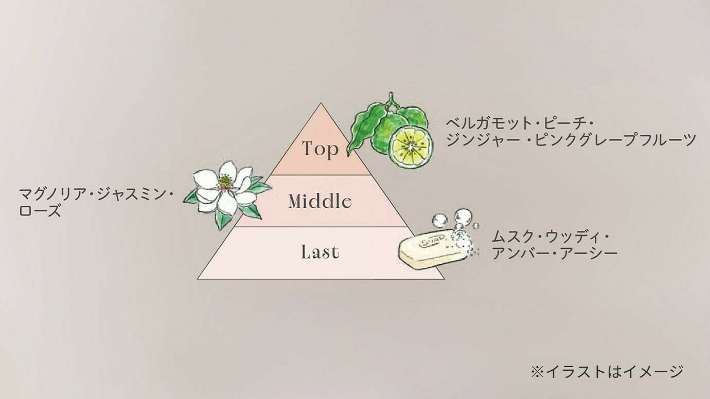 - ・香り:ベルガモット、ピーチ、ジンジャー、ピンクグレープフルーツから始まり、マグノリア、ジャスミン、ローズを経て、ムスク・ウッディ・アンバーへ