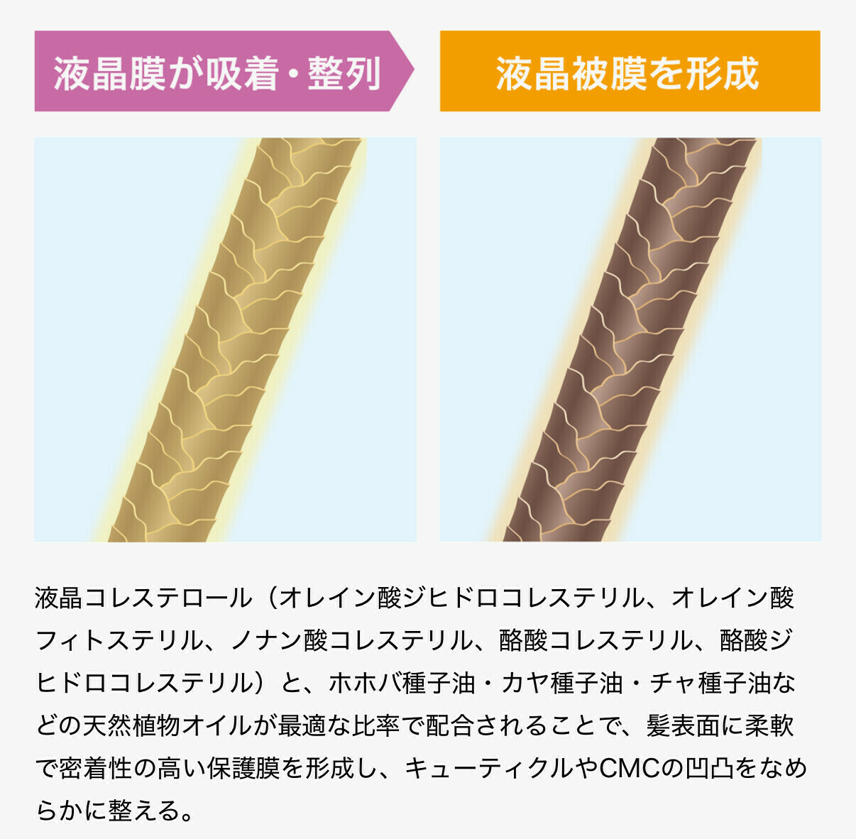 リケラオイル独自の液晶皮膜が髪表面を均一にコーティング。